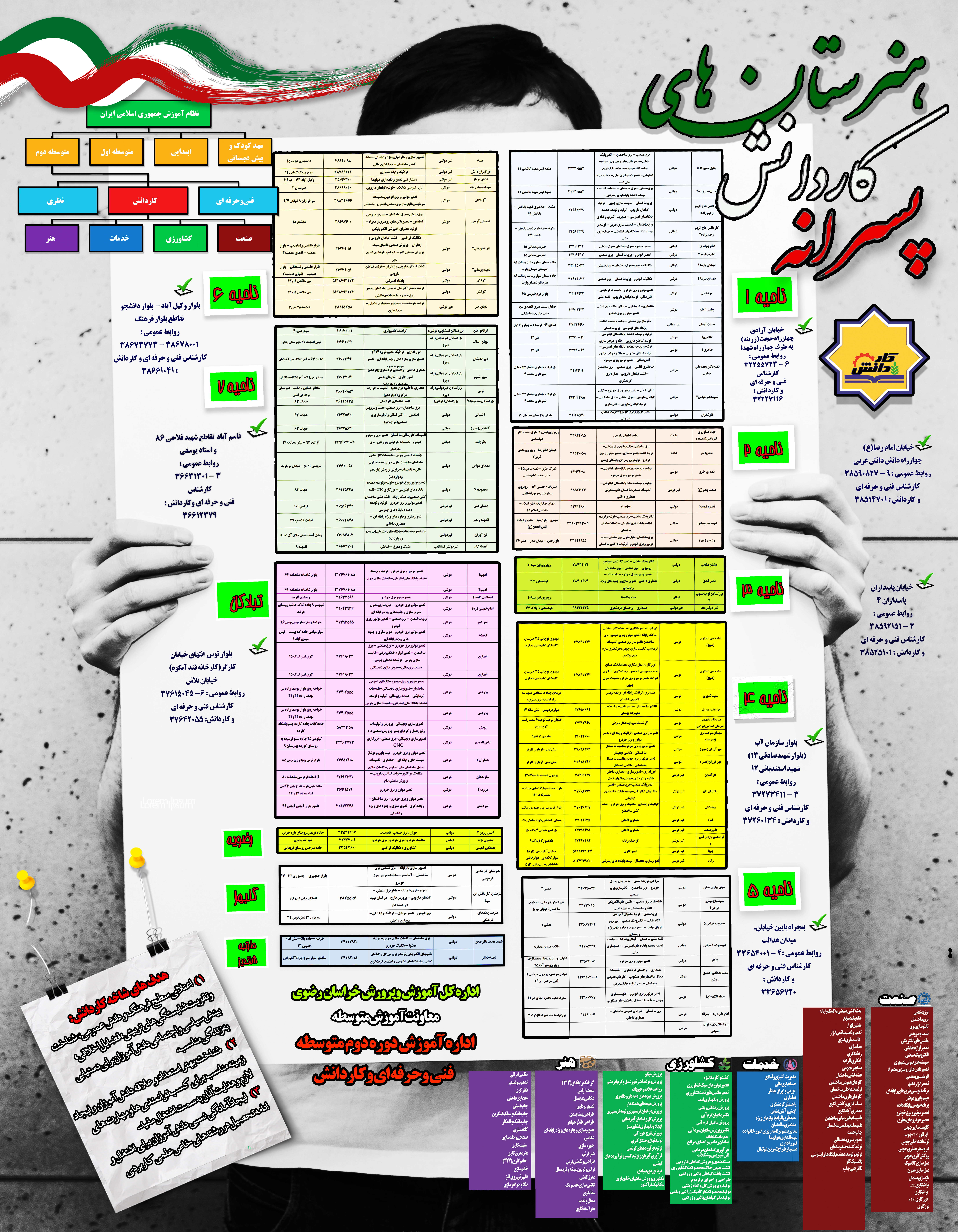 دانلود پوستر معرفی هنرستان های کاردانش پسرانه شهر مشهد 1403 (شامل: آدرس، شماره تلفن و رشته های موجود در هر هنرستان به تفکیک نواحی)
